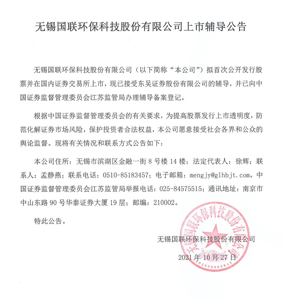 無(wú)錫國(guó)聯(lián)環(huán)??萍脊煞萦邢薰境闪⒂?011年1月27日,是一家以污泥減量化、無(wú)害化、資源化處置為產(chǎn)業(yè)化發(fā)展的國(guó)有控股企業(yè),股本為109,470,852元。